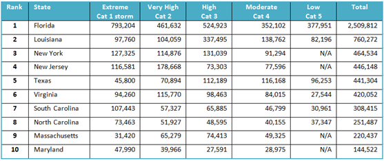 States like New York, however, have much less coastline to deal with, but due to the density of residential housing along the coast, the number of homes potentially at risk tops 464,000 and has a total RCV that ranks second. The potential damage to New York was brought into perspective in the aftermath of Hurricane Sandy in 2012 and its estimated $60 billion in damages, placing it second only behind Hurricane Katrina on the list of costliest Atlantic hurricanes.