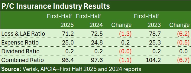 First-half 2025 losses and loss adjustment expenses rose at about the same pace, up 2.1% over first-half 2024, but earned premiums rose 3.9%, fueling more than a 1.3-point drop in the industry loss and LAE ratio.