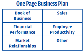 Using a single sheet of paper, draw a vertical line down the middle and two horizontal lines to split the page into thirds. The paper will have six equal size boxes. Prioritize the list of five areas of primary focus (book of business, sales, etc.). Write the top two topics on the top of the top two boxes, the next two topics on the top of the middle boxes and the fifth topic on the top of the lower left box. Leave the lower right box blank at this point. Now start planning!