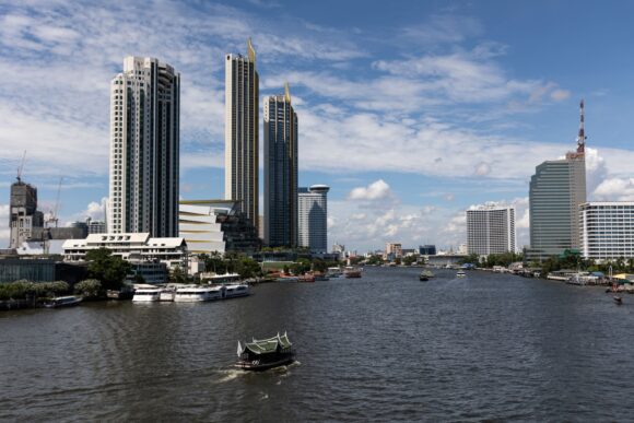 Photograph: Boats navigate past buildings along the Chao Praya River in Bangkok, Thailand, on Saturday, Feb. 19, 2022. Photo credit: Luke Duggleby/Bloomberg.