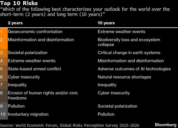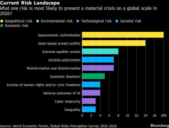 Respondents specified “geoeconomic confrontation” and “state-based armed conflict” as the two biggest risks, in answers delivered even before US President Donald Trump’s high-stakes trade talks with his Chinese counterpart in October, and this month, his attack on Venezuela and his declaration of intent to annex Greenland.