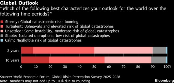 Half of respondents anticipated a “stormy” or “turbulent” outlook in the next two years, a notable increase from the 2025 report. The proportion rises to 57% when looking a whole decade ahead, though that result is actually an improvement from last time.