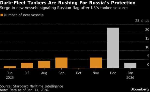 At least 26 ships have switched registration to Russia since the beginning of last month, with the bulk of those happening after the US snatched the Skipper supertanker off the coast of Venezuela on Dec. 10, according to Starboard Maritime Intelligence data. That’s a jump from six in November and just 14 over the previous five months.