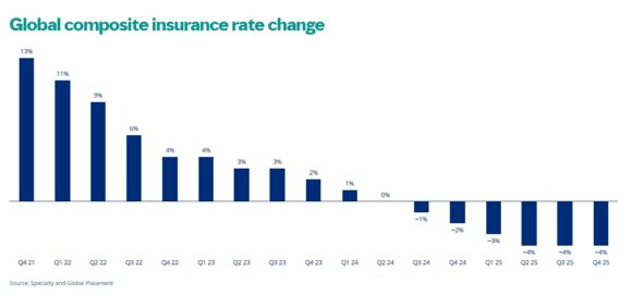 Global commercial insurance rates declined by 4% in the fourth quarter of 2025, marking the sixth consecutive quarter of rate decreases, after seven years of increases, according to the Global Insurance Market Index published by Marsh Risk, a business of Marsh.