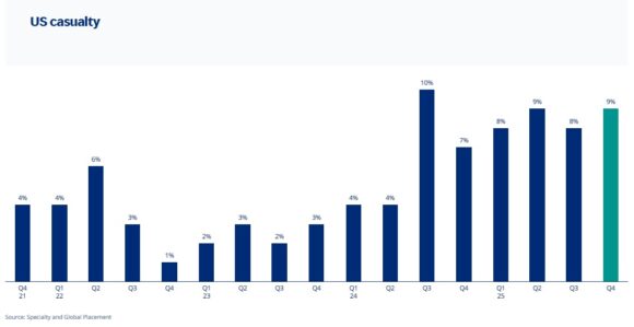 The main exception to the general softening trend was US casualty where rates increased by 9% during Q4 2025, compared to 8% in Q3, and workers’ compensation rates rose 12%.
