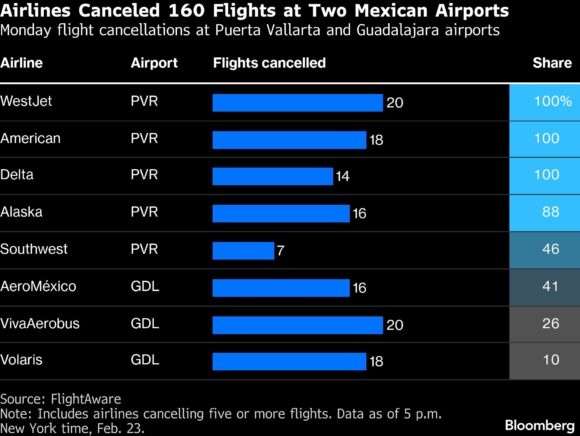 On Monday, Aeromexico announced that flights to and from Guadalajara, Puerto Vallarta, Manzanillo and Tepic were “progressively normalizing” with regular operations expected by Tuesday at the latest. Yet elsewhere, concerns have proliferated that the violence will continue to spread.