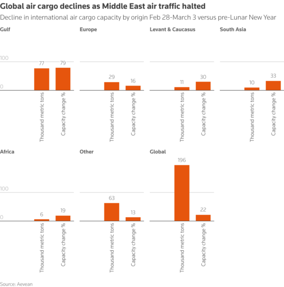 The U.S. and Israeli air war against Iran has grounded passenger and freighter flights across the region, including in key global air cargo hubs Doha and Dubai.
