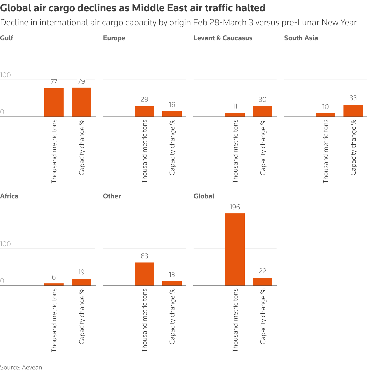 Middle Eastern carriers account for about 13% of global air cargo capacity, according to Aevean.