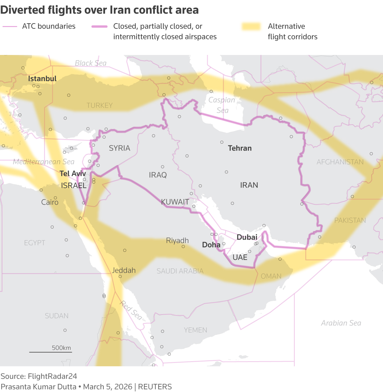 The month-old Iran war is reshaping airspace across the Middle East and increasing disruption to flights, including clogging routes between Asia and Europe that previously transited or flew over the region.