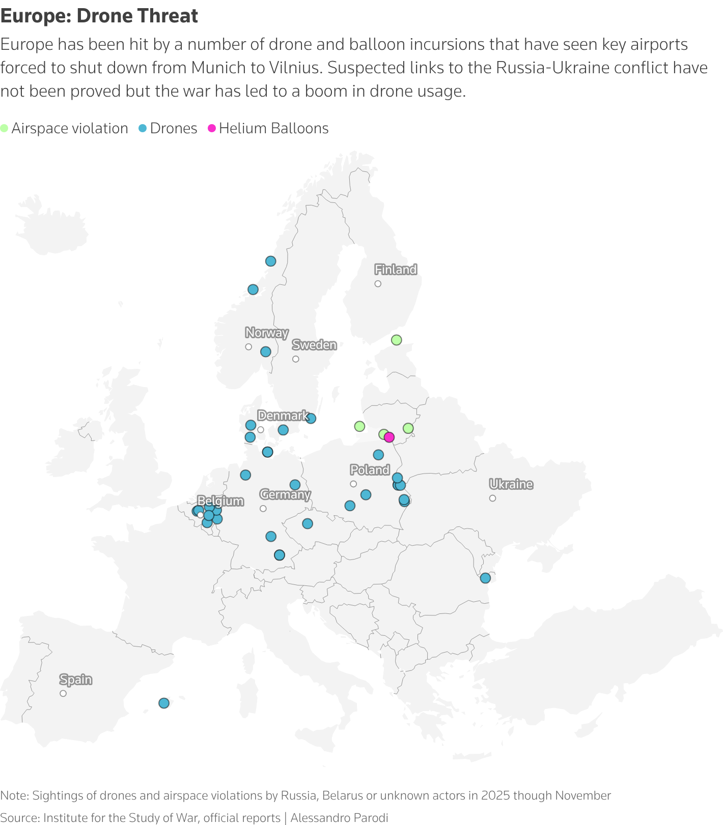 Since Russia’s 2022 invasion of Ukraine, drones have become a key weapon on both sides. Airports from Stockholm to Munich have faced drone-related disruptions, suspected though not confirmed to be linked to the conflict.