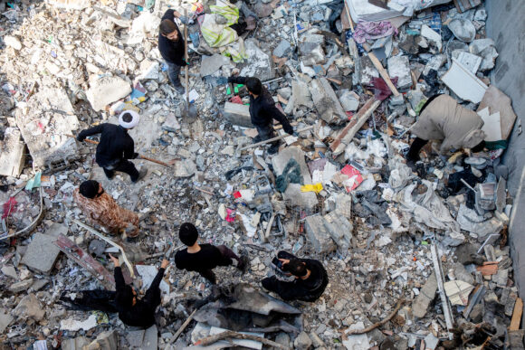 Photograph: People sift through rubble following a strike in Tehran, on March 31, 2026; Photo credit: Majid Saeedi/Getty Images