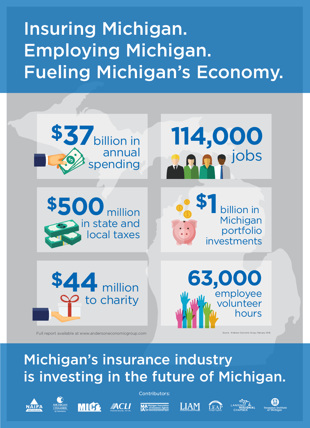 The Economic Footprint of Michigan’s Insurance Industry was prepared by Anderson Economic Group and commissioned by the Michigan Chamber of Commerce, the Lansing Regional Chamber of Commerce, the Lansing Economic Area Partnership, the Michigan Economic Development Corporation, the Life Insurance Association of Michigan, the Insurance Institute of Michigan, the Michigan Insurance Coalition, the Michigan Association of Insurance Agents, and the National Association of Insurance and Financial Advisors – Michigan.