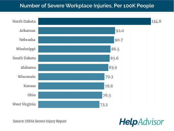 The Help Advisor research team analyzed new data from OSHA to identify North Dakota as the top state for injuries suffered at work, which includes broken bones, amputations, burns and traumatic injuries or disorders.