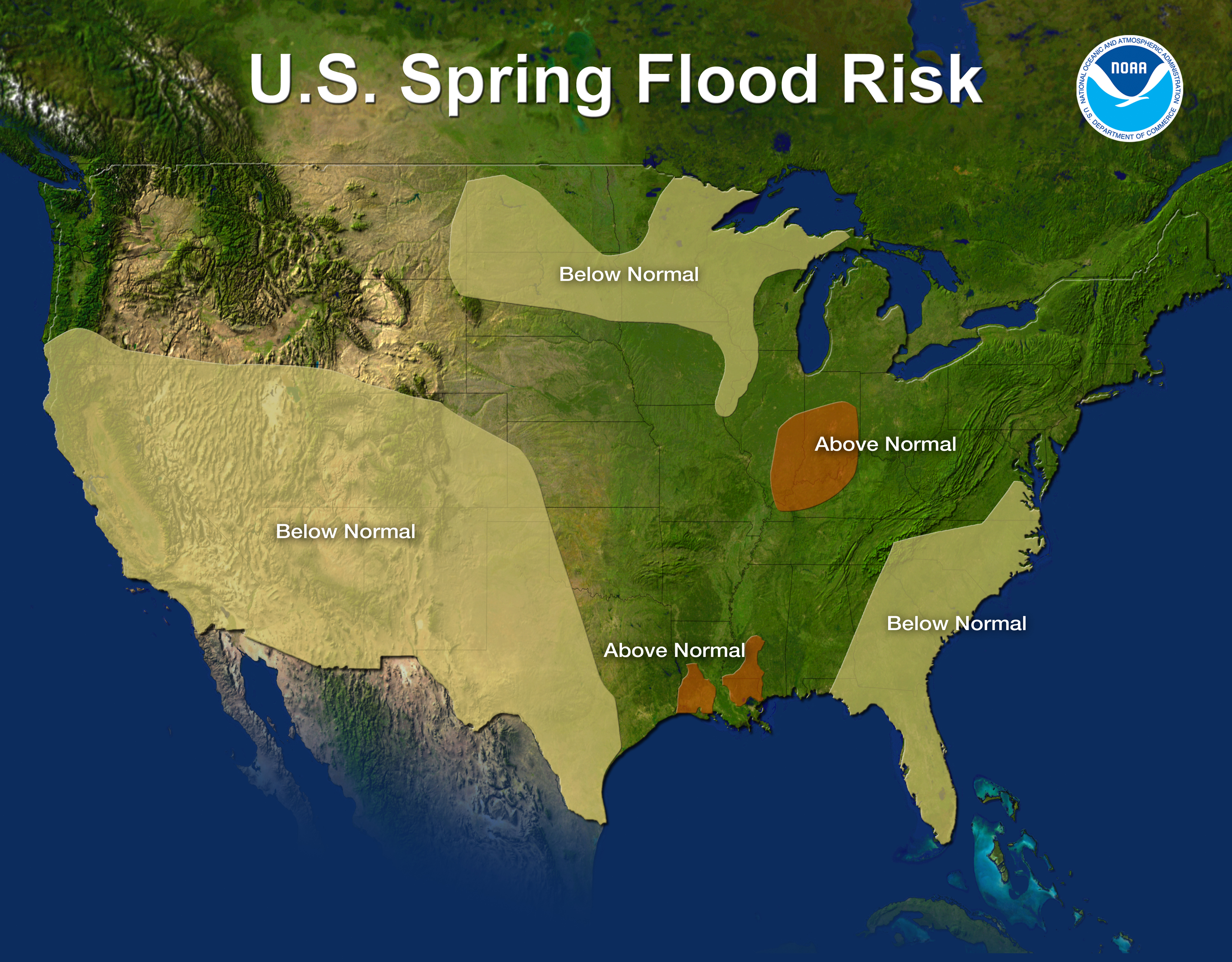 River and stream water levels are normal to below normal for most of the country and there is less snow pack than in previous years. As a result, there is a normal flood risk from the Northeast, through the mid-Atlantic, across most of the northern Plains and into the Northwest. However, heavy spring rainfall can lead to flooding at any time, even in areas where overall risk is considered at or even below normal.