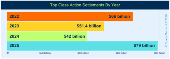 The value of the 10 highest class-action settlements in 2025 exceeded $70 billion for the first time ever. In fact, the total was nearer to $80 billion across all areas of litigation, according to law firm Duane Morris.