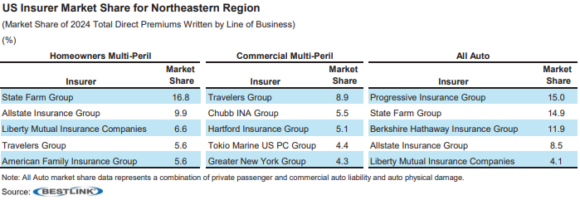 Looking at the Northeast region, the top homeowners insurer is State Farm with nearly 17% market share. The insurer also has about a 15% market share in auto along with Progressive.
