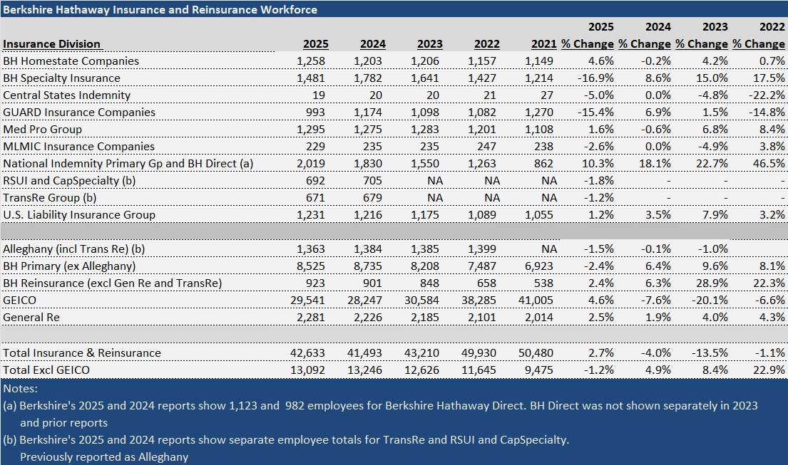 For the most part, employee counts for Berkshire’s insurance operations other than GEICO fell in 2025, compared to 2024. Notable exceptions were Berkshire Hathaway Direct, growing staff count by more than 14%, and National Indemnity Primary Group, up 6%. Berkshire also reported staff growth of roughly 2.5% in its reinsurance operations.