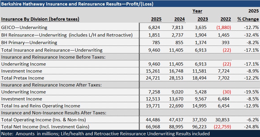 On the bottom line, including gains and losses from sales of investments and accounting for other-than temporary impairments of several investments, Berkshire reported $67 billion on net income for 2025, down 24% from $80 billion in 2024.