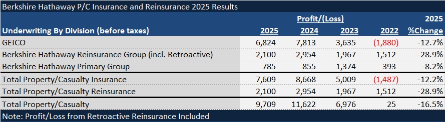 Personal lines insurer, GEICO, the largest in the group, accounted for more than 50% of the $1.9 billion year-over-year drop in pretax underwriting profits reported for the Berkshire property/casualty units overall. On a percentage basis, across all the P/C operations, pretax underwriting profits fell 16.5% to just over $9.7 billion.
