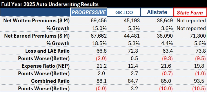 Unlike competitors, State Farm, Progressive and Allstate, which reported improvements in loss and loss adjustment expense ratios ranging from 2 points to almost 10 points in 2025, GEICO’s loss and LAE ratio worsened slightly, according to the annual report.