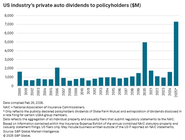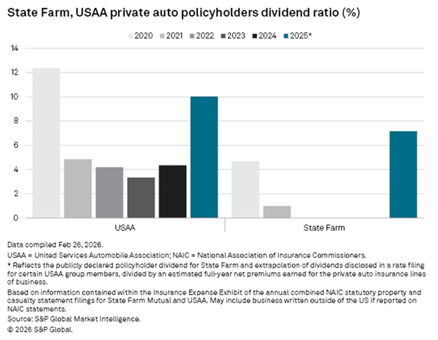 At USAA, roughly $4 billion of dividends going out to members in 2025 represented a higher percentage of the military insurer’s auto earned premiums—nearly 10%, according to S&P GMI’s calculations.