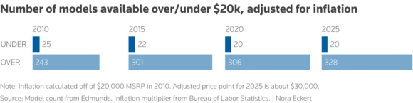 Meanwhile, budget models remain scarce. In 2010, there were 25 models priced at around $20,000 or less. By last year, there were only 20 models available at that equivalent price today, or roughly $30,000.