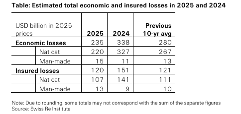 Man-made insured losses during 2025 were US$13 billion with man-made economic losses of US$15 billion.