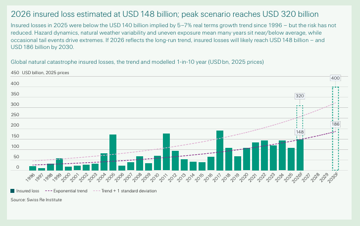 “The below-trend natural catastrophe losses seen in 2025 are the result of favourable variability rather than any easing of underlying risk. If losses return to normal long-term levels, they would total US$148 billion in 2026,” commented to Balz Grollimund, head Catastrophe Perils, in a statement accompanying the report.