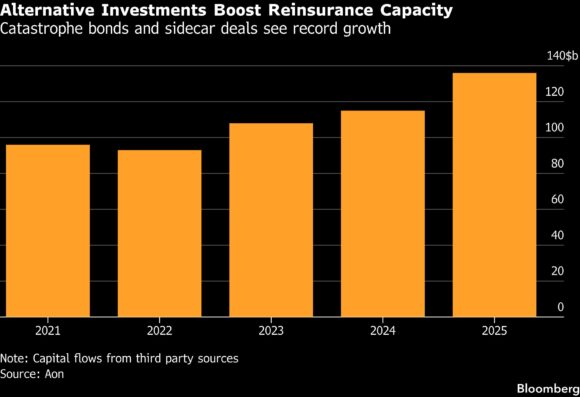 Reinsurers are also attracting record levels of private capital into so-called sidecars. Such vehicles give third-party investors access to premiums, in exchange for which they must accept a slice of the risk associated with natural disasters. It’s a market that’s nearly tripled in size since 2023, reaching as much as $18 billion today, with much of the growth coming from property catastrophe coverage, according to AM Best, a rating agency that tracks the insurance industry.