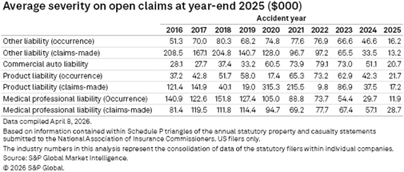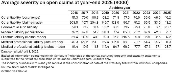 Medical professional liability occurrence reached $151,768 per open claim in accident year 2018, which represents the highest severity figure across all casualty insurance lines before moderating in more recent years, a typical trend for newer claims where cost pressures continue to emerge and mature.