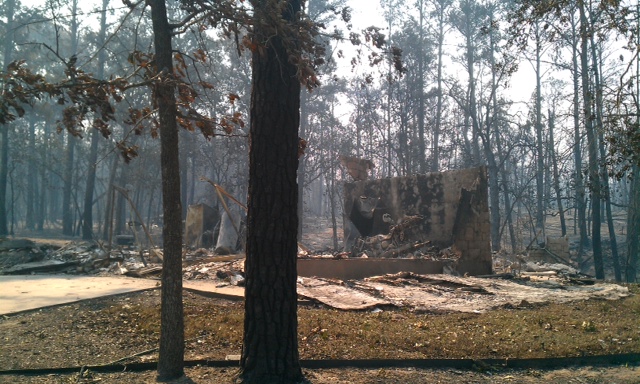 The Whitts lived on the east side of Tahitian Village that was hardest hit by what would become the costliest wildfire in Texas history. It would be 11 days before John would get the opportunity to see his home. He did not go alone. He had with him his insurance adjuster, Joe Long of the Texas Farm Bureau.