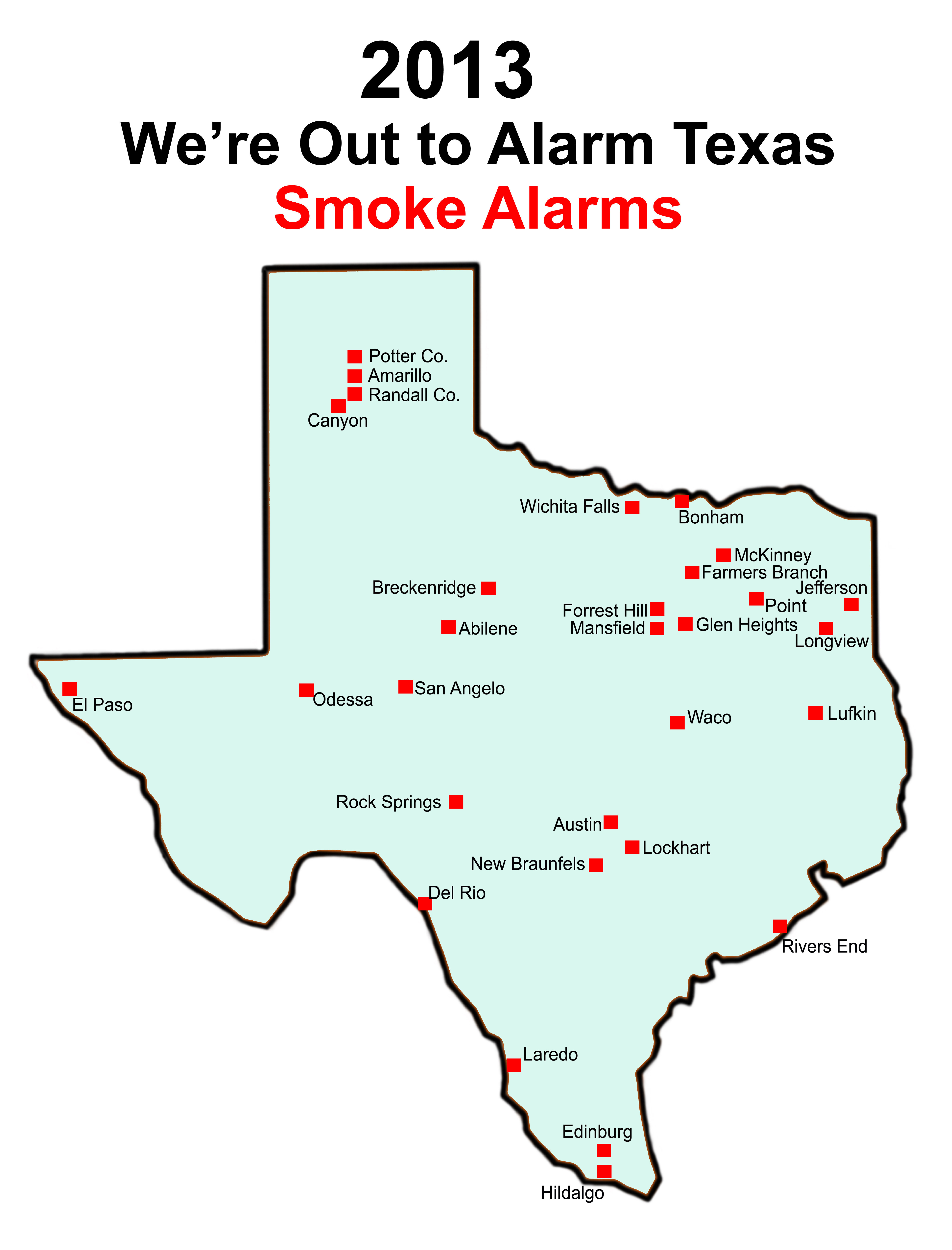 Fire departments receiving smoke alarms for the first time through the We’re Out to Alarm Texas program are Del Rio, Laredo, Austin, Rocksprings, Point, Canyon, and the volunteer fire departments in Potter and Randall Counties.