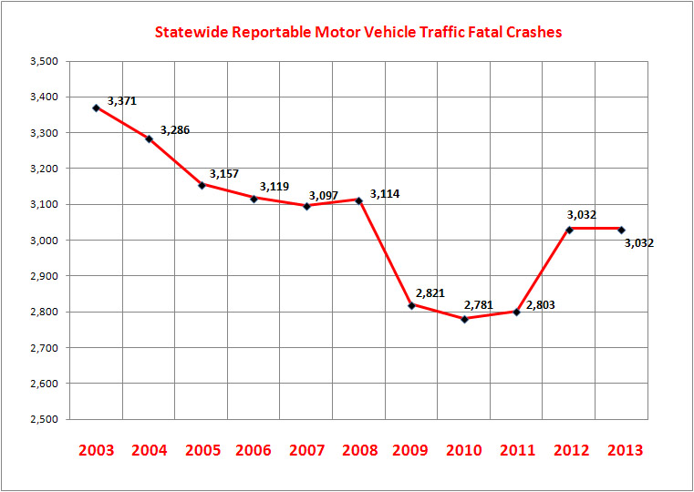 In 2003, fatal crashes in Texas had dropped from 3,371 to 3,067 in 2011 or a 10 percent decline. But the past two years the numbers have shot back up above 3,330.