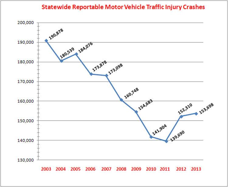 In 2003, Texas Department of Transportation figures showed the state had 190,878 injury crashes, but the number had dropped to 139,690 or a 27 percent decline by 2011. But in the past two years the numbers have risen exceeding 152,000.
