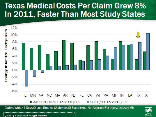 The WCRI study, CompScope Medical Benchmarks for Texas 14th Edition, said the growth in medical payments per workers’ compensation claim in Texas was faster than in prior years and more rapid than in most other states in the study.
