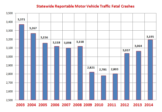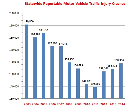 Traffic fatalities bottomed out in 2010 and then slowly began to increase in 2011. In 2012, when higher speed limits were posted across the state, injury traffic collisions increased 8.3 percent, while statewide traffic fatalities increased 9.1 percent. Both numbers continued to increase in 2013 and 2014.