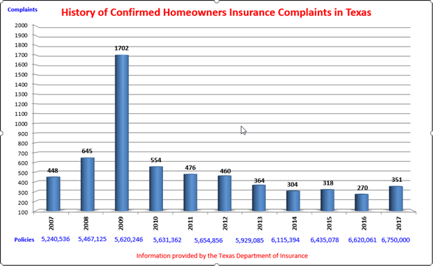 Since a high of 1,702 complaints in 2009, justified homeowner complaints have continued to drop in the succeeding years. In 2016, justified homeowner complaints declined to only 270 complaints in a year in which there was more than $4 billion in homeowner losses from the state’s record hailstorms.