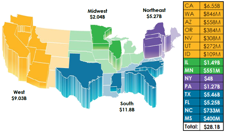The Southern Region of the U.S. reported the largest total premium at $11.8 billion. The region includes newcomer North Carolina, whose $733 million premium contributed to the total Southern premium growth of 6.8 percent. In its 30-year history, Texas reported its best E&S premium year, ending at $5.46 billion.