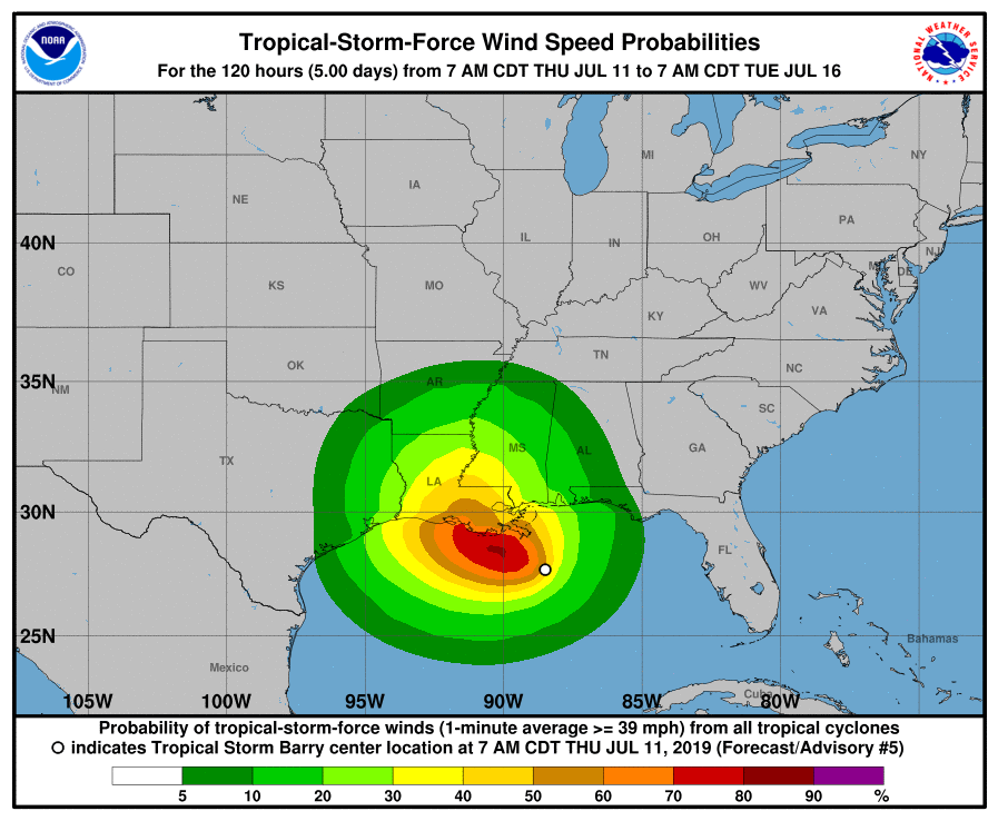 Tropical Storm Barry formed in the Gulf of Mexico and could strike Louisiana as a hurricane Saturday, causing almost $1 billion in damage and worsening flooding in New Orleans.