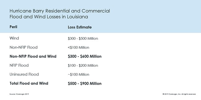 CoreLogic estimates Barry-related flood loss for residential and commercial properties in Louisiana will come in at between $200 million and $400 million, which includes both storm surge and inland flooding.