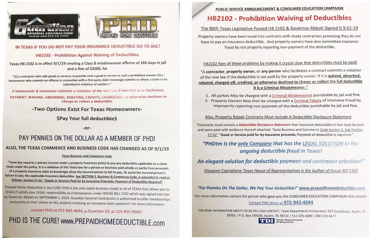 TDI says both of the deceptive fliers mention a new state law that makes it illegal for a contractor to waive an insurance deductible. One claims to be a “public service announcement” and uses the Texas Department of Insurance logo. Reports indicate the scam may be targeting older storm victims.