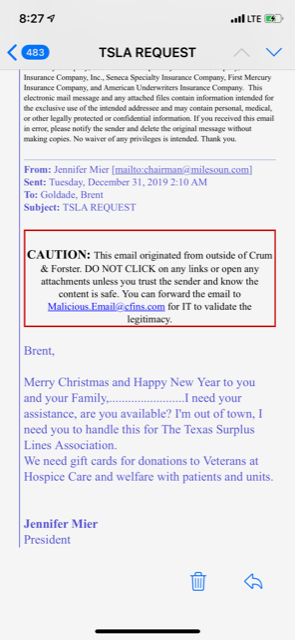 The Texas Surplus Lines Association is warning its members of a fake email that has been sent out under the name of TSLA President Jennifer Mier. TSLA is urging members not to respond to the email.