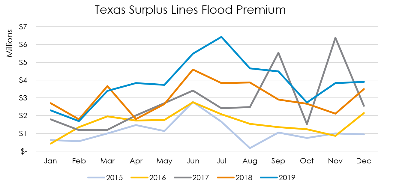Surplus lines flood insurance in Texas has grown significantly over the past few years. In 2016, SLTX recorded $19.13 million in flood premium, which grew to $33.13 million in 2017 and $36.07 million in 2018.