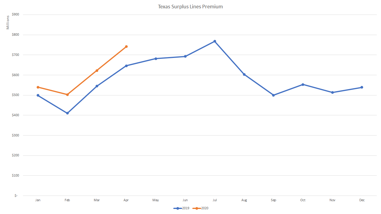 Texas surplus lines premium during the month of April 2020 reached $741.68 million, according to the Surplus Lines Stamping Office of Texas (SLTX). This is a 14.8% increase over the same period in 2019, SLTX reported.