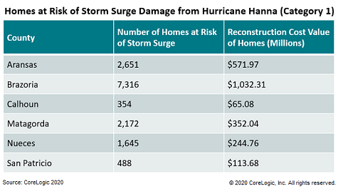 CoreLogic has estimated that more than 14,000 homes were at risk of storm surge damage from Hurricane Hanna, which made landfall in South Texas on July 25.