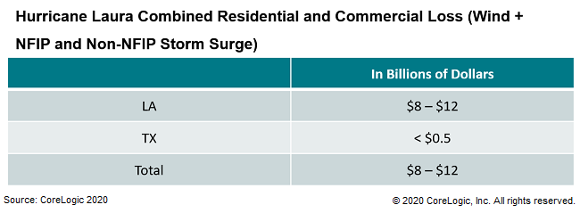 Property information, analytics and data provider, CoreLogic, has estimated residential and commercial insured losses from Hurricane Laura in Louisiana and Texas will come in at between $8 billion and $12 billion.