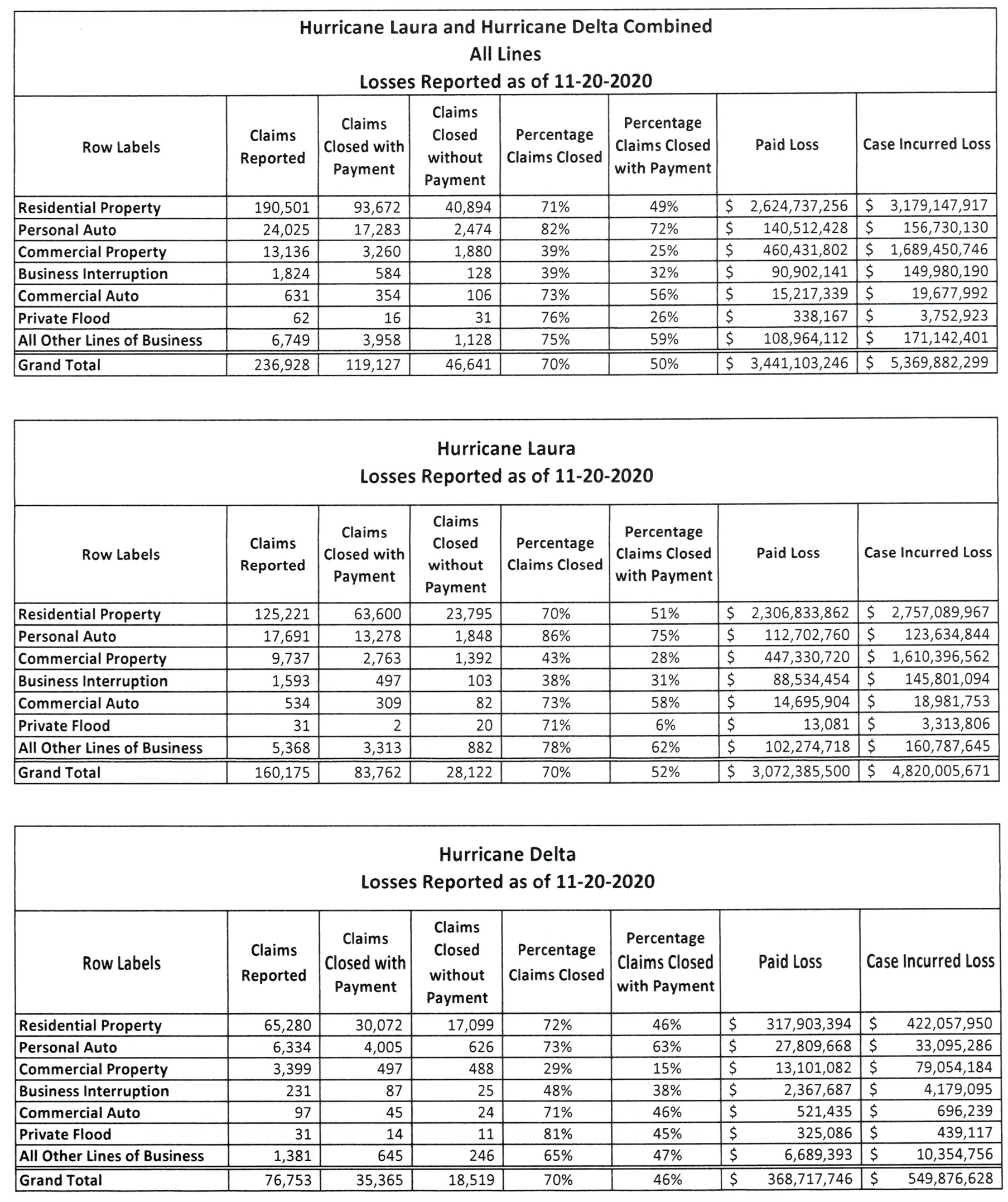 Claims data from the two storms was presented at a joint meeting of the Louisiana House and Senate insurance committees on Dec. 16. The information is derived from insurance department calls to insurers for claims data related to Hurricane Laura and Hurricane Delta.