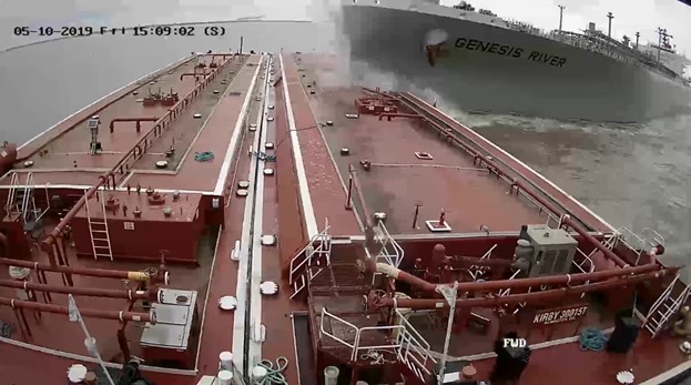 The National Transportation Safety Board has released a report on the collision between a liquefied propane gas tanker and a barge on the Houston Ship Channel May 10, 2019, in Texas’ Upper Galveston Bay. The collision between the 754-foot-long liquefied Genesis River and the 297-foot-long tank barge 30015T breached two cargo tanks in the barge, spilling approximately 473,600 gallons of reformate, a gasoline blending stock. There were no injuries.