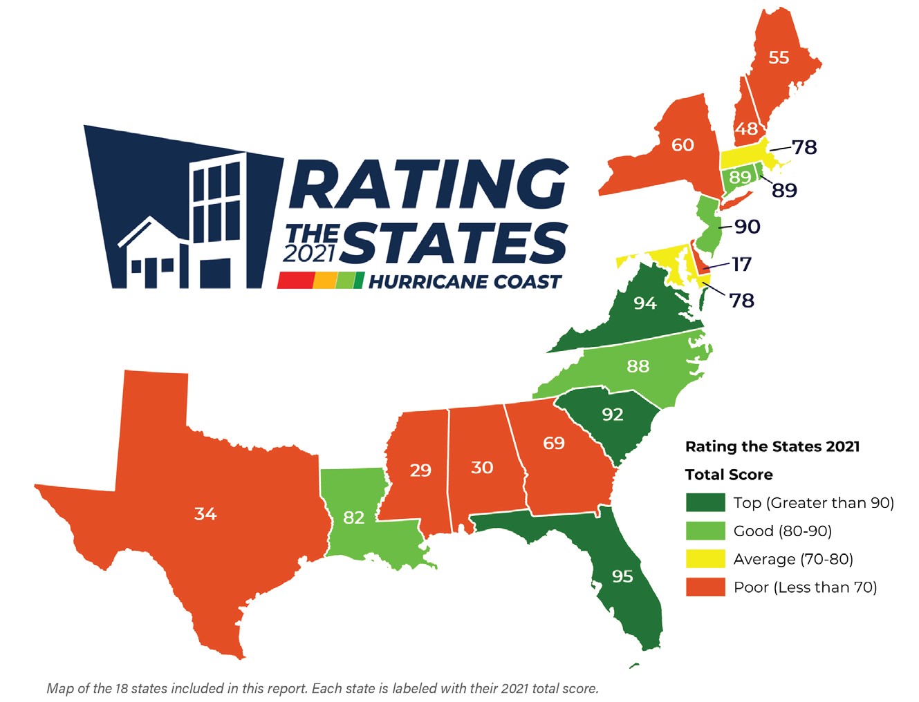 The “Rating the States: 2021” report by the Insurance Institute for Business & Home Safety explores conditions in the 18 U.S. states with hurricane vulnerability, evaluating both building codes and the administration of code provisions.
