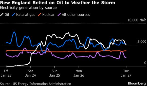 Starting during the earliest hours of the morning on Jan. 24, the grid’s use of the fuel shot up from less than 1 gigawatt-hour to nearly 8 gigawatt-hours, surpassing natural gas. Oil plants usually provide zero energy to the grid in New England, and operators only turn them on when necessary, like during a storm.